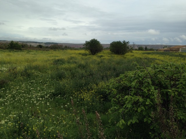 The drizzle that lasted most of the day, the later strong headwinds persistently coming at us and the majority of trail being rather rocky meant that we were always walking today with our heads looking at our feet. Every time we looked up, we either got a face full of water, our hat was blown off or we tripped. So I can’t tell you too much about the scenery except that it was fairly flat, bar the exit from Alcanadre and the entrance to Calahorra. It was also over back country lanes with a bit of blacktop, some compacted dirt portions but mostly rocky rutted roads. We were usually within sight of the train line or a highway, both of which we knew went to Calahorra.