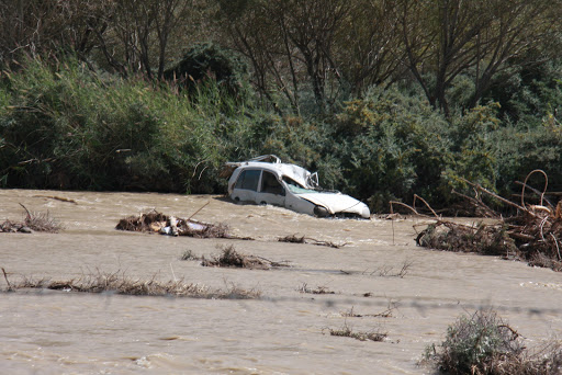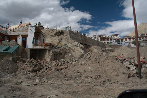The sad part of the day was driving through Chonglamsar village as we went back to Leh. We had been through this town just south of Leh several times and it is a Tibetan enclave. Most of the people living there are refugees from Tibet or second generation immigrants. The normal main street through the village is as two lane road bordered by shop houses. Today, two weeks after the flood, the road through is barely a single lane bordered the whole length on both sides by 2 1/2 meter mountains of mud. You can just see the wreckage of the tops of the shops from high up in the jeep. Some buildings looked still intact but others were a mess. The amount of mud that travelled several kilometers to bury this town is mind-boggling. We also stopped to take some photos of the devastation near the Leh hospital.