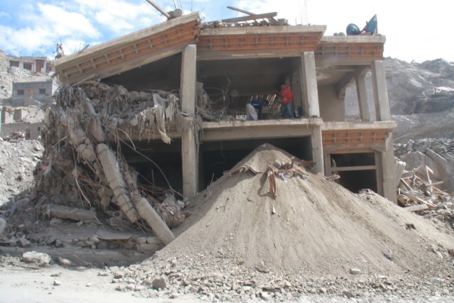 I spent another day digging out a larger room in the hospital while Melanie rested at the hotel. There seemed to be more volunteers today. I must admit that I was near my limit in wielding a shovel so I spent most of the day one the wok crew. As the young men shoveled the mud into woks, everyone else passed the full woks, one to the next, down the line until the last person threw the mud through the window. There would be a bulldozer coming later to clear the area outside. Eight hours of passing heavy mud in this altitude is pretty darn hard work but we had fun. Most people chatted about everything under the sun as we worked. One of the main topics though was definitely about the smell of the mud. How did it get so bad? I’ll never know. Occasionally, something like a child’s doll or a shoe would be dug up. That usually silenced everyone for a moment as it got passed down the line in the wok. Fortunately, we never dug up anything grimmer than that. By late afternoon, I was happy to be going back to the real world. I walked back to the hotel and collapsed onto the bed.