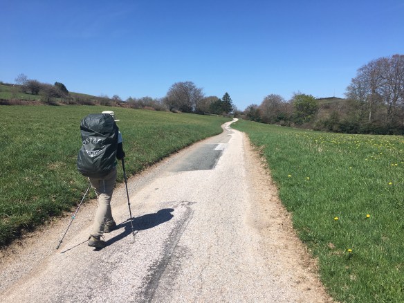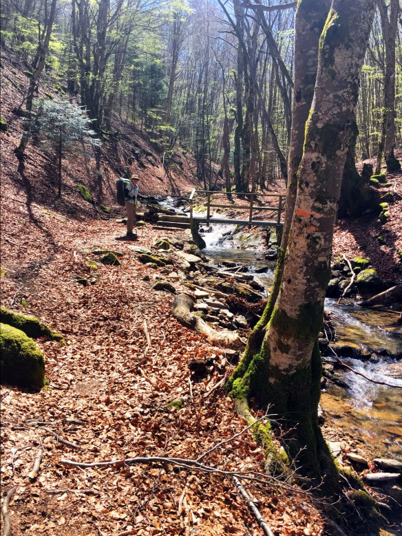 A fantastic walk today! It was challenging with a long climb from 320m up to 1,020m but the terrain for the first 19km was varied and lovely. I complained yesterday about the long stretch of the logger’s road. Today, we were rewarded with changes of terrain every couple of kilometers. We had shady forest paths, dirt logger roads, very short stretches on roads in or near villages, stream-side paths, rocky climbs, deep forest trails covered in leaves, etc. it was only when we reached the summit that we were dumped out onto a quiet country lane that eventually wore out its welcome. It did make the descent into Murat-sur-Vebre easier on the knees, if not the feet. Also, since we were cursed with 25 days of glorious weather, we still haven’t seen any clouds, only a hot sun.