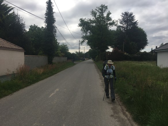 We started today at 7:45pm, after breakfast of bread, croissant, yogurt, juice and coffee that was left for us at the hotel. The sky was clear as we walked back to the church to get on the trail. We looked around for a taxi but the village was still mostly asleep. We watched one pilgrim couple heading off in the distance the wrong way as we turned at the church. The side doors were open so we went in for a prayer. I think I heard God saying it was okay to skip the 8km so we headed off towards Lescar, following the red and white blazes. About 100m further on, I looked at my GPS to mark Lescar and I realized that we were actually walking backwards towards Anoye – the other couple were on the right trail. The blazes go in both directions. Also, yesterday, we came in the east bound trail last night because we were dropped off on the west side of town. Was this THE sign? Still, there was no taxi. No, God had us turn the wrong way so that we could find the open side door of the church. We turned and went the right way.