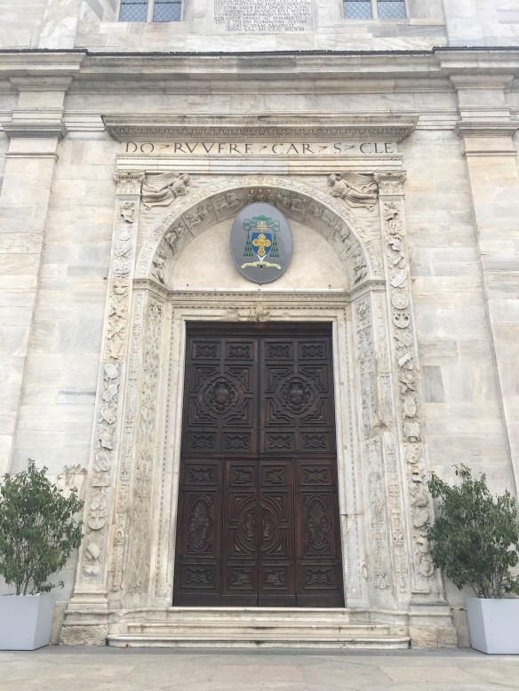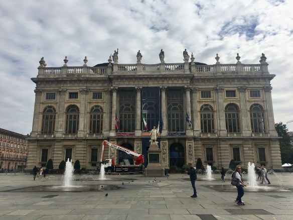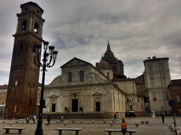 The bank we needed was 2km further down the trail, the museum was 1km from the hotel back down near yesterday’s trail and the Basilica was a further 1km beyond the museum. That’s how we got our mileage in. We also slept in a little later, found a nice sidewalk cafe for breakfast and another for lunch as well as a gelateria. We are carbo-loading for the mountains. We managed to arrive at the museum just after the start of their break (noon to 3pm) and to the Basilica just before their afternoon break (1 to 4pm). We got kicked out before we got to the Shroud. All is good though. We just hang around and ate until we could get in those places. The Basilica’s souvenir store also held a stamp for our credentials.