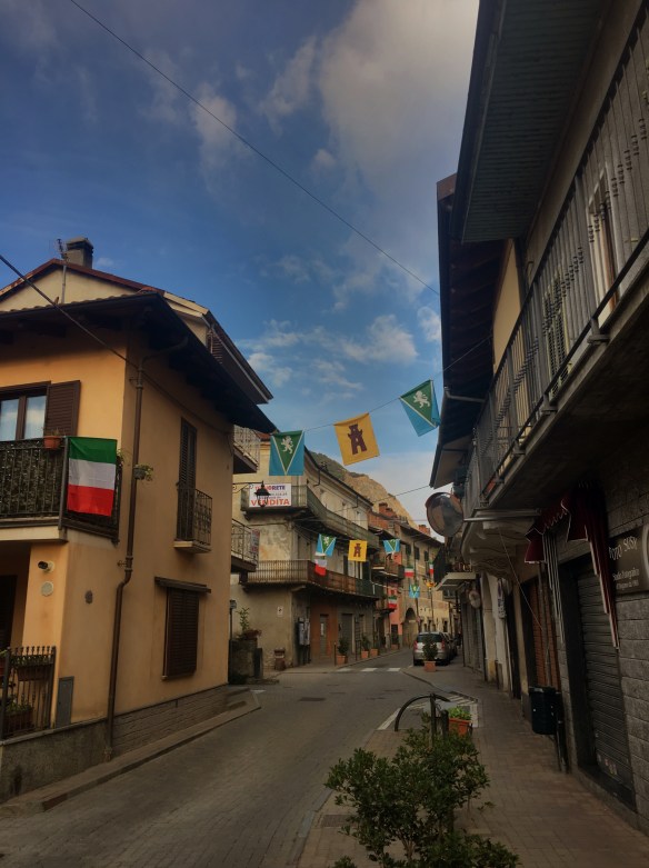 Shamed, we headed down the decently small and barely used road, Via Roma. ALL roads lead to Rome even if we are going the opposite direction. We arrived in the village of Sant’Antonino di Susa and visited the town’s church which, oddly, was named after the same saint. How novel. Across the square in front of the church was a perfect bar to share a ham and cheese on focaccia and get some lemon soda.