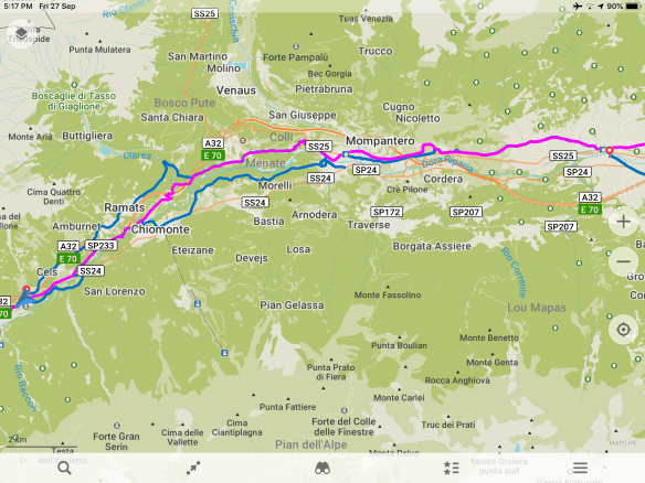 Up to Susa, we had two GPS trails but it was easy to choose which one to take. The way-marked trail is on quiet rural roads and even a bit of gravel and grass. The alternative was just straight down the main road between Bussoleno and Susa. That would not have been fun. It was at Susa though that we had two vastly different options in GPS trails, one north of the river and another one to the south. It appeared that the southern option was the marked trail so we took that. Holy moly. Who complained about flat road walking before? Not me! Not me!