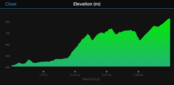 The first 10km was pretty much what we were used to, a mix of rural and urban roads almost flat, and 85% on blacktop roads or sidewalks. The rest was rough. We had a total elevation gain of 692m and a loss of 287m with most of both of those changes being quite steep and in 29C (84F) heat.