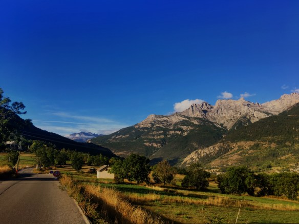 Our route stayed on the Domitia trail until the 6km mark in the village of Le Vilaret, at the bridge over the river. This route took us out of Briançon on a very quiet road for 5km, then a very nice downhill, multi-media, grass / rock / dirt / mud / gravel trail for 1km. At that point, instead of crossing the bridge over the river and getting on a busy road all the way to Les Vigneaux, we climbed back up the hill to our earlier quiet road, having bypassed 1.5km of it. This road took us another 3.5km during which about five cars passed us. At that point, it joined up with a busy main road (five cars every minute) that usually had a decent sized road shoulder marked off that theoretically kept us safe. This portion of busy road would take us the last 5km into L’Argentière.