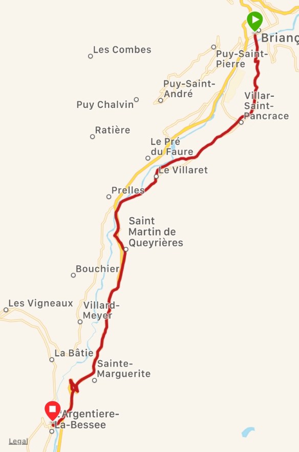 Until yesterday, we were walking the Via Domitia. Today, and possibly tomorrow, we are walking the Via Do-Smithia. While researching yesterday about today’s trail and where to walk to, I had an epiphany. I had originally planned to walk to Les Vigneaux, a small village that seems to be on a side spur of the main Camino trail. Our guidebook – which describes our trail backwards, from Arles to Vercelli – said the today’s trail from L’Argentière climbed on forest tracks to Les Vigneaux “then there is a difficult choice of a long and tiring 500m climb then the descent to the valley floor or a unpleasant 10km walk on a main tarmac road” and it recommend the road option. Those choices didn’t sound like fun. I asked maps.me to plan a walking route from Briançon to L’Argentière and it bypassed Les Vigneaux completely, staying east of the river until reaching our hotel. This route was supposed to be 16km, compared to the guidebooks way of 23km and what actually looked more like 25 to 26km.