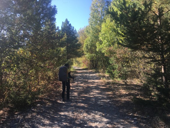 We started our route today south, through the rest of the village of L’Argentière-la-Bessee to rejoin the marked Camino route just after crossing the rail tracks. After 3km of walking on quiet roads, the Camino lead up a steep gravel path. We had planned to take this path, which was expected to climb a little more than 400m but then decide after 1km on that trail and 170m of the climb if we wanted to bug out. At that point, there was a trail leading back down to the quiet road where we had pencilled in a possible, flatter alternative. We looked at that first climb though, from the road, and it looked tough. It was obviously about a 17% incline so we said to each other, that looks insane and there is no way we wanted to do the whole trail on that rough surface and steep incline. We continued down the road toward Plan B, and after another 2km, we saw the trail that we would have come down if we bugged out – and we probably would have – and this trail looked to be on about a 35% decline on loose gravel. We would have had to ski down it!