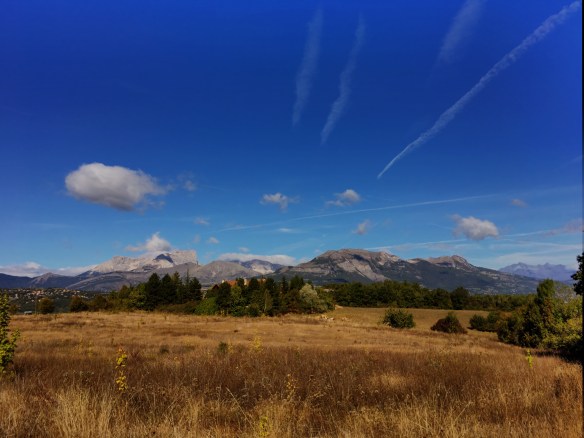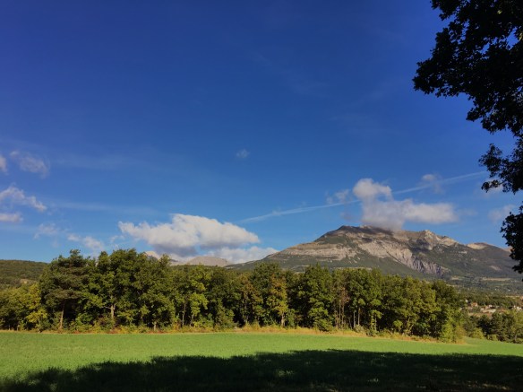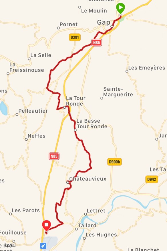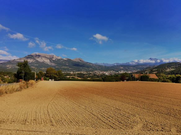 The terrain is clearly transitioning from mountains and deep river valleys to a wide valley with foothills at least on one side. Theoretically, we have several more days of tough climbing but that’s in question at the moment. Tomorrow we plan to walk to somewhere around La-Motte-du-Caire and finding accommodation is an issue. Even using a old trick looks tough. We thought about staying in Tallard two nights, taking a taxi to La-Motte in the morning and walking back here, then taking another taxi the next day to the same spot and walking forward. The problem with that trick is a taxi would be very expensive because La-Motte is not easily accessible from this side of the mountains. We’ll work something out.