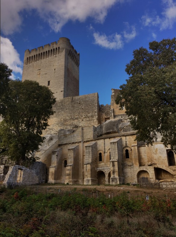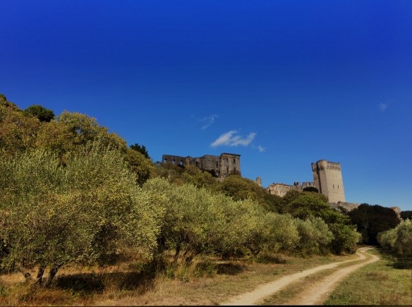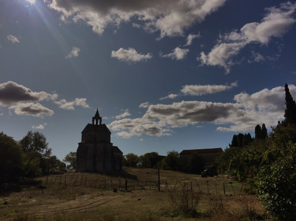Now on the correct trail, a kilometer of forest trails and another of quiet roads brought us back to the busy D17 for two more kilometers to the Abbaye-de-Montmajour and nearby Chapelle-Sainte-Croix. This is when the Camino magic happened. At the 12th century Chapelle, we found an open gate, ignored the “private” signs and went on the grounds to take a picture. Leading towards the Abbaye, we also saw some huge stone buildings that looked almost as old but they appeared to be more like barns or storage places for farm equipment. I convinced Melanie that we keep going past these towards the Abbaye when we saw a man and and older woman talking. We called out, asking if we were allowed to walk around their small property to the Abbaye. We were told that we could not, and that the bit that we thought was their small property was just the residential part. Their farmland extended hundreds of acres past the fencing around their chateau and we were not supposed to be there. As we quickly made our apologies and turned to leave, the woman asked us to stop. I prepared to be told off for trespassing. “Are you pilgrims?, she asked. Yes. “To Santiago?” Yes again. “With credentials?” Oui, once again. “Well then”, she says, “can I get you some water?” And also, “let me show you a special way”. She walked us a half kilometer down her back driveway, close to the back of the Abbaye property and pointed out the way for the final trail for the last half kilometer to her back gate. Melanie described her as a cross between Audrey Hepburn and Queen Elizabeth II. She chatted with us the whole way, asking about our walk, telling us about the abbey and its history. Everything was in French but spoken so well that we could understand her. As she left us, her simple wish was that when we arrived in Montpellier, we say a prayer for her and she said that she would pray for our safe journey. She was a Camino Angel.