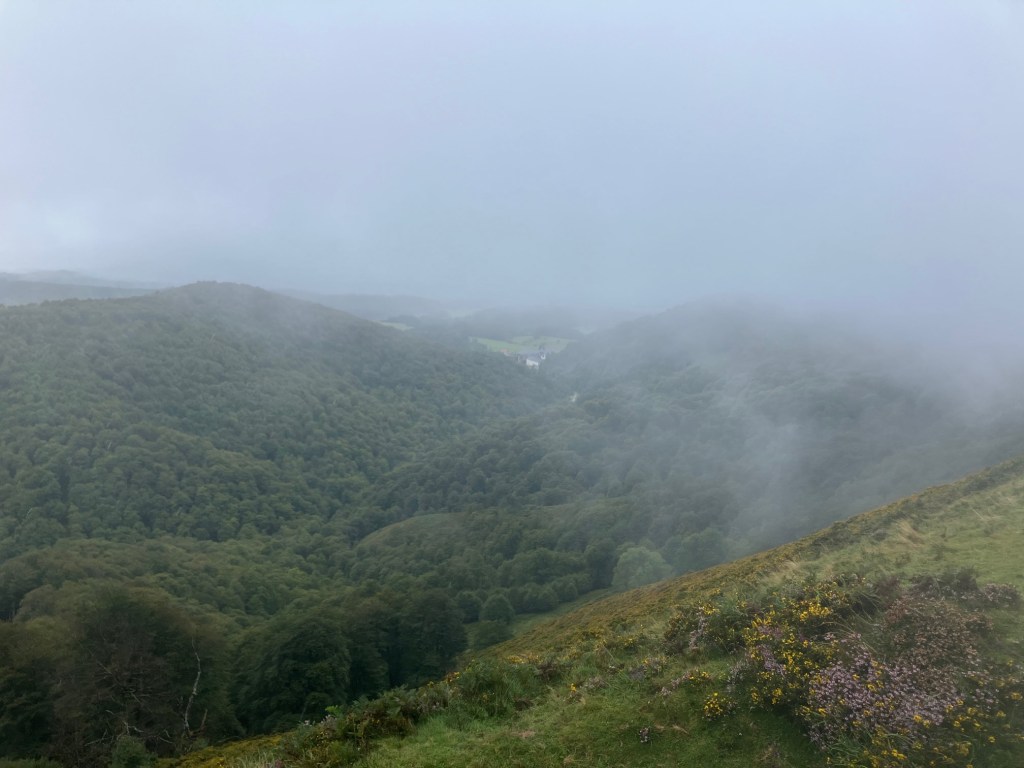 We made it over the Cize Pass but it wasn’t too easy. It rained pretty much the entire day and sometimes the wind was howling. In fact, there is one small hut built for pilgrims stuck in a storm on the exposed side of the pass. As we approached it in the exposed area, suddenly the wind started blowing hard enough to knock us off balance. My umbrella (and Melanie)somehow survived until we got to the shelter 100m away. Even in the lee of the shelter, it took several minutes to close the umbrella. Then, of course, we fought our way through the 20 or so pilgrims standing cheek to jowl who were already there and reassessing their holiday plans. Our walking time today includes a half hour stay in the lovely “Hotel Izandorre Refugio” where we ate our picnic sandwich (a ham and cheese baguette), told jokes about leaving bad Booking.com reviews about the place (the hot tub was out of order, etc.). It was fun.