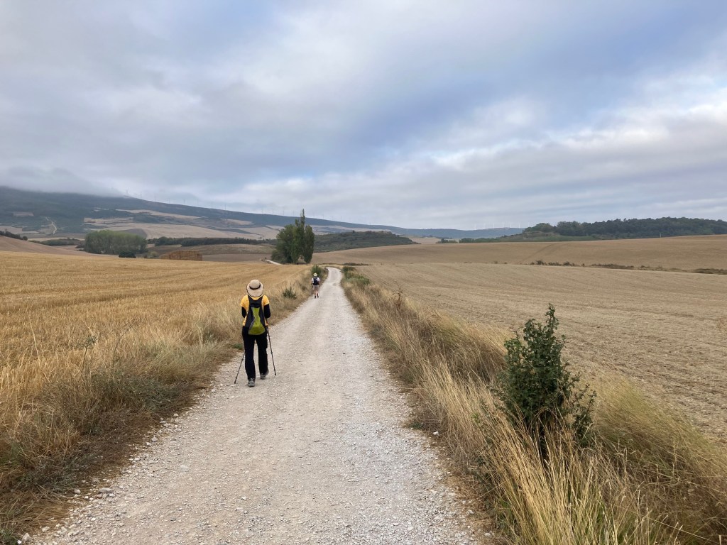 The highlights of todays walk included no rain, cool air until 10:00am, sun after that and the stunning views from the Alto de Perdón, which is an iconic Camino site, I wonderful climb and a scary descent. Melanie sent her bag ahead again today and even sent her poncho. No rain was forecast and none came despite some distant rain clouds. It only started getting really hot after reaching the Alto de Perdón and I managed to use my umbrella for shade. As long as there is no wind or low hanging branches, the umbrella worked well. I think it reduced the temperature around me by 5º. At least it felt that way.