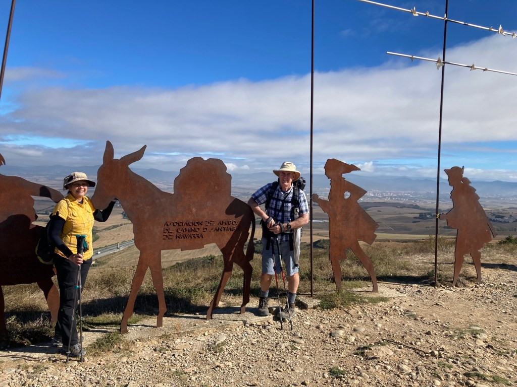 At the Alto de Perdon, the atmosphere was joyous. A few dozen pilgrims were there when we arrived and a parade of others followed. Some were just sitting either soaking in the sun or reflecting about host of possible things to themselves. The views in every direction are stunning and I particularly like looking back at the Pyrenees where we were just a few days ago. Pamplona seems close enough to touch but it is 12km away. Almost everyone had to pose for a photo here so we did to.