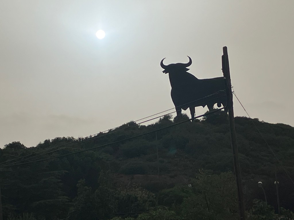 We were somewhere near a lake, Pantano de la Grajera, when Melanie spotted the full moon, trying to poke through the haze and clouds. It looked huge when close to the horizon and the following photo over a vineyard doesn’t do it justice. It took me several minutes before I realized though – wasn’t the full moon last week? Also, I think that moon is setting in the East which maybe it shouldn’t be doing. That pale white disk in the sky was the sun. It’s been that long since we have seen it, I guess. By 10:00am, it had burned away the clouds and was working on doing the same to us. It’s 6:00pm at the moment and it just started raining again so, who knows what is in store for us tomorrow.
