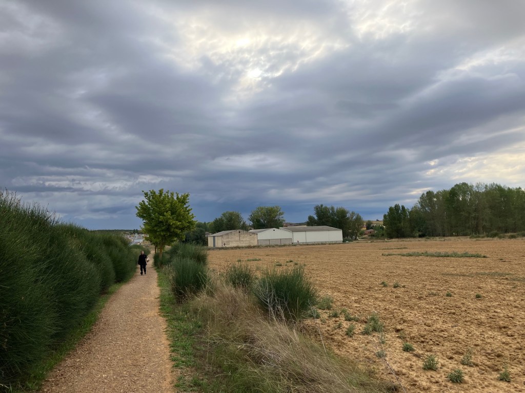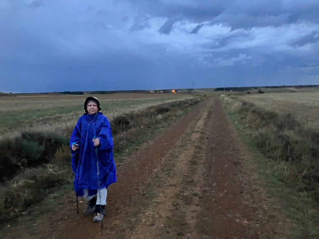 Our plan was to wake up at the usual 6am but we had everything packed so we could get out quickly to walk under the stars. If you want to hear God laugh, make plans. Around 4am I awoke to loud thunder crashing nearby. This was a surprise. Eventually the rains came so after some more sleep we got all geared up for the rain and walked outside at 7am. Three seconds later, the rain stopped. It was on and off the whole walk, even alternating with bright sunshine as we reached the last 5km into Bercianos.