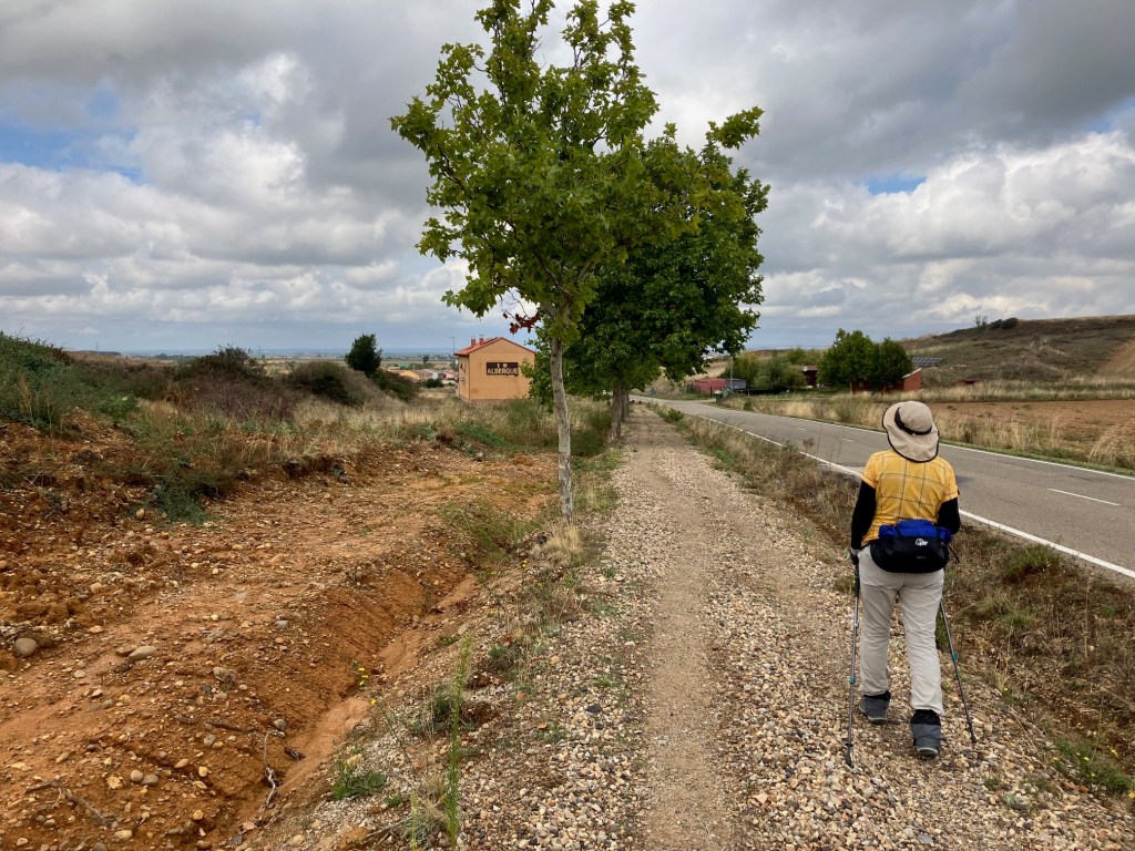 On the horizon between that yellow albergue and the single tree to its left is the mountain with the Cruz de Ferro which we will climb in four days.