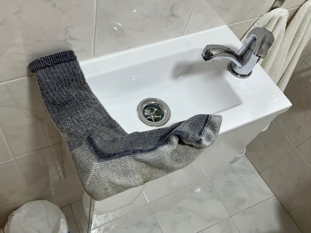 Speaking of small bathrooms…. Melanie suggested that we (that means “I”) just wash the inner clothes in the room and see if we can dry them someplace outside since it was sunny. After thinking about that for three seconds, I suggested that we (“I” again) wash all our walking clothes and anything else that needs washing in the laundromat that we saw advertised nearby. I suggested it to save time tomorrow in León when we would certainly need to wash things. That leaves us more time for sightseeing. My idea won the day because of two things. First, by the time we finished showering and settling in, it started to rain so once again, our room would be decorated with dripping clothes. Secondly, I walked into the bathroom to see the sink I could use to wash the clothes. It was just large enough to wash one sock at a time. The undershirts would need two sessions, left side and right side. Even when I wash my teeth, I’m going to have to be careful spitting out the toothpaste in case I flood the room.
