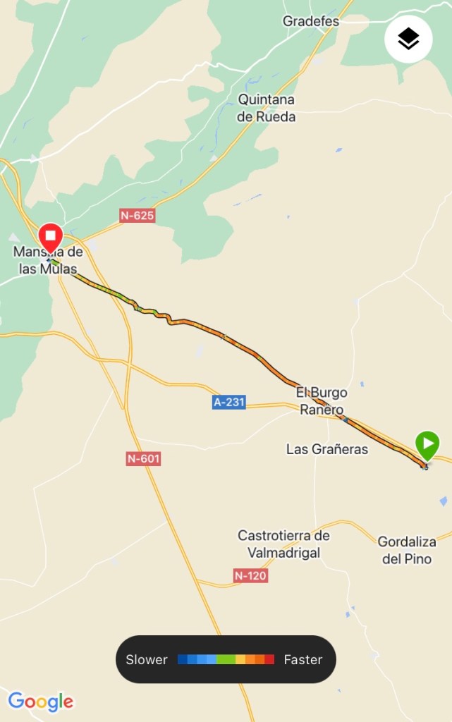 Because we walked this route before, I knew to look out for something that pilgrims would appreciate. As we came down a small hill just before the first albergue in the village of Reliegos, I used Google maps to confirm the direction for me. From that hill, I could see the iconic mountain that we will climb in four days. If all goes to plan, we will walk to Leon, San Martín del Camino and Astorga, about where the Meseta really ends. The following day we hope to walk most of the way up the mountain to Foncebadón and the the next day to the top and the Cruz de Ferro. It’s the highest point on the Camino but we are already on a high plain (and physically stronger) so it shouldn’t be too strenuous, even though it’s steep. It’s just cool to see that mountain range again. It’s the gateway to Galicia and Santiago de Compostela.