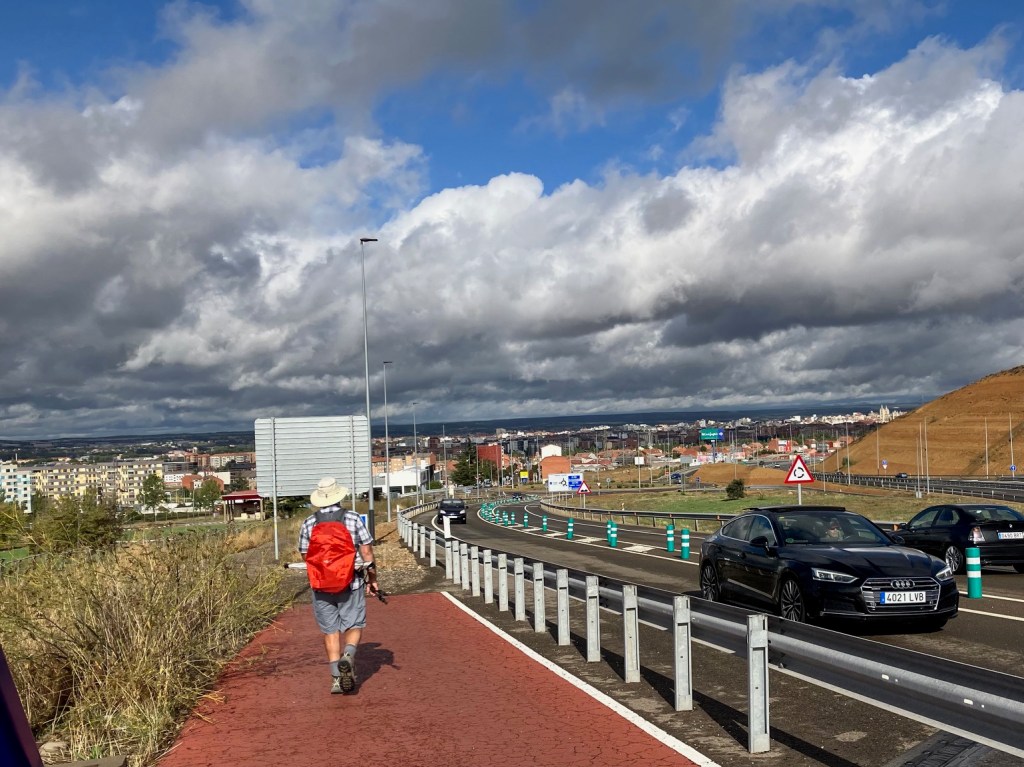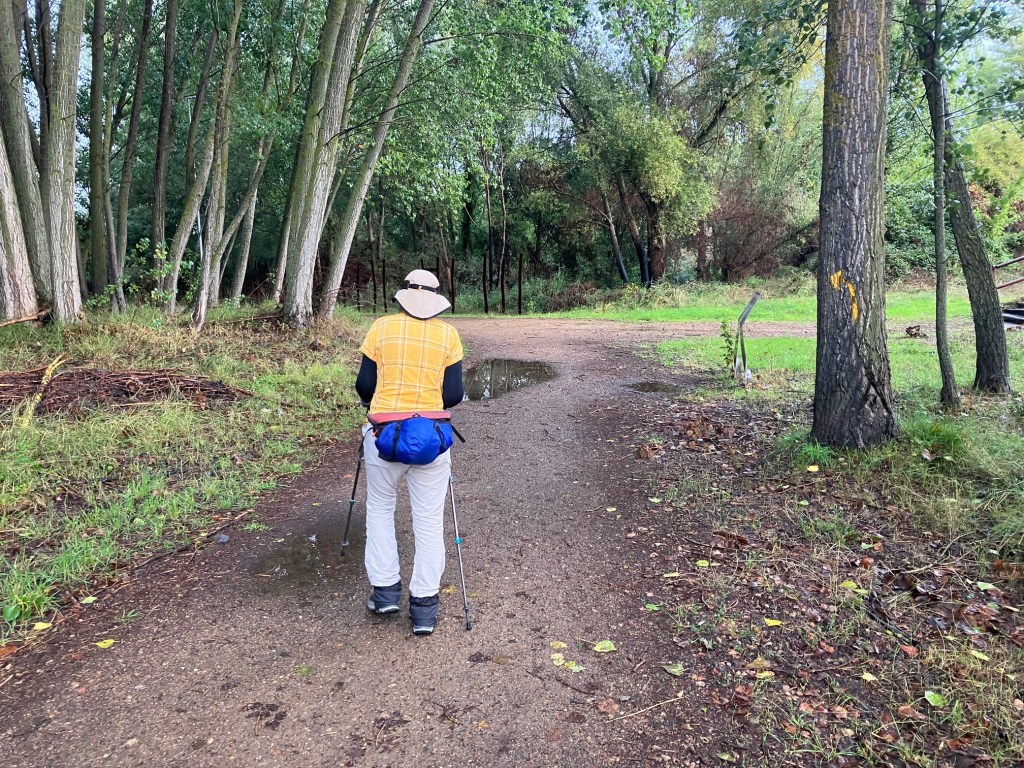 Our breakfast #1 was scheduled for Villamoros, only 5km from where we began. We followed the signs to the bar which was off the Camino. Sadly, it was still closed at 8am and we walked a extra few hundred meters to find that out. Fortunately, only another 1.5km took us to Puente de Villarente where there were many options for sustenance including the first bar, right on the Camino. We were happy. Not only did we get fed but the rain was over for the rest of the walk despite some threatening clouds.