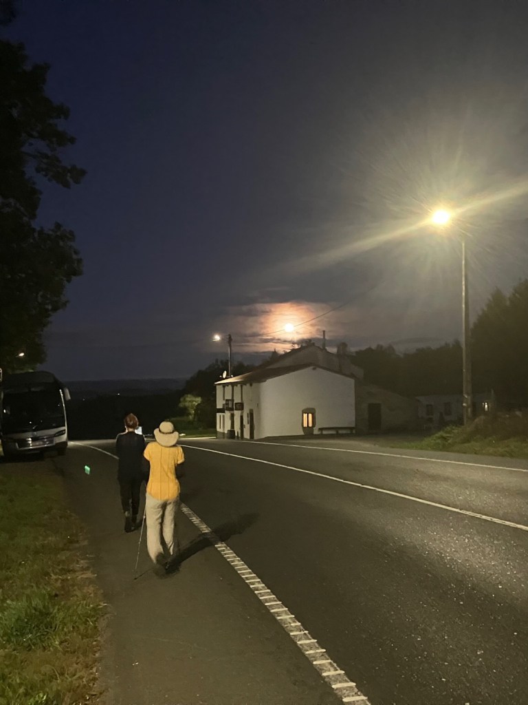 The start to the day was also less than ideal. We had breakfast at the guesthouse which saves us from an early stop but also took longer than a normal breakfast. We weren’t out the door until 7:45am but we were rewarded with a nice setting moon. The hostess from last night also insisted on showing us a shortcut back to the Camino through the forest behind her house. I tried to explain that I knew the best route back to the Camino but, as I said, she insisted. We followed her off her property, into the forest, then she turned to us, rattled off the directions in Spanish, then returned home. We tried to follow what we though she said but it really didn’t look promising. I kicked myself for listening to her as I studied the map and knew the shortest way. After some wandering around, we crossed a field and went my way which I am certain was the route that would have saved us mileage. Unfortunately, we wasted about 700m trying to follow her route first.