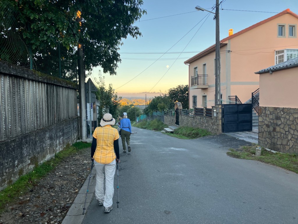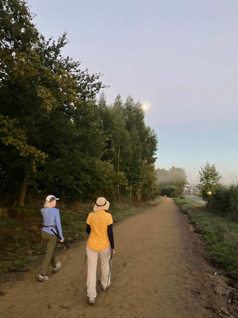 If you were following on Facebook, you know we arrived in Santiago de Compostela yesterday. We only had 16km to go with a single big hill that started exactly at our hotel in Amenal. Of course we stared at 7:30am after a normal (normal for us in Spain) breakfast and it was still dark on the forest trail despite the full super moon. Part way up the hill, we heard behind us the distinctive Bronx accent of Nancy, a pilgrim we have walked with many times since Roncesvalles. It was her friend that helped me up when I fell on Day 3. Yesterday though, we heard her say “Is it okay if I follow right behind you since you have a pace and I don’t trust my torch?” As gruff as I could I joked “no, this is our trail”! That kept her quiet for a minute, which was the longest we have her silence lasted this whole month. I was wondering how she didn’t recognize my voice or haircut or Melanie’s shirt but then Nancy started talking again. About the moon, the trees, her albergue, her blisters, etc. eventually she asked where we were from. She really didn’t recognize us. I just turned and showed my face in the light. She shrieked, then laughed, then smacked me for saying she couldn’t follow us. It was pretty funny. We ended up walking about 6km with her before another man we see pass us every day got Nancy to walk a bit faster with him.