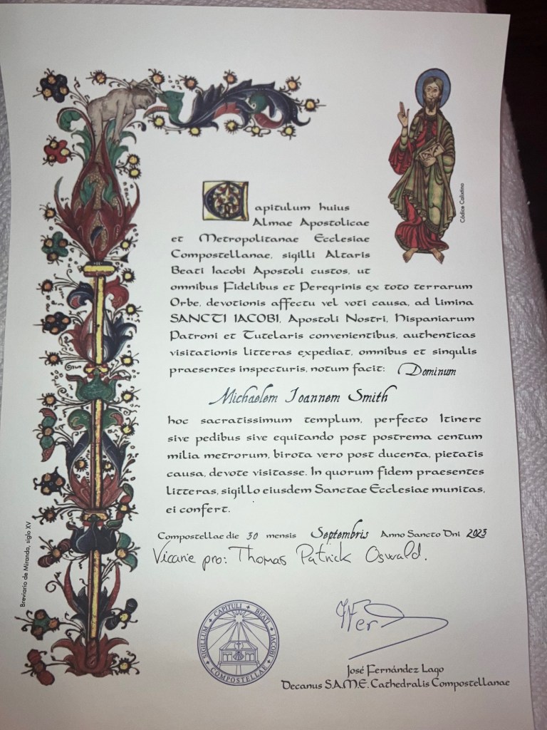 We went down to the Pilgrim’s Office during the noon pilgrim’s mass because that is when the queue is the shortest. Despite having to amend my Compostela, the entire system went very quickly. We guess COVID allowed the office time to breathe and improve their workflow. We were done in there in about 30 minutes. Outside the Pilgrim’s Office e met Maria and Not Maria (another Mia, apparently) who were emotional wrecks.