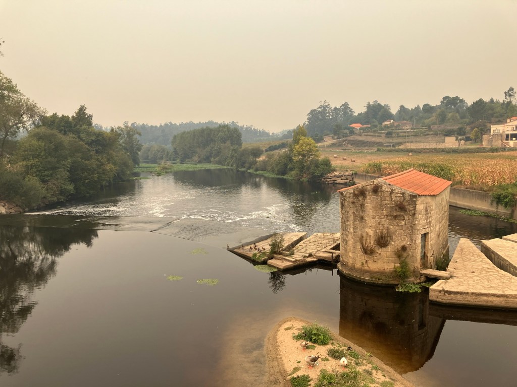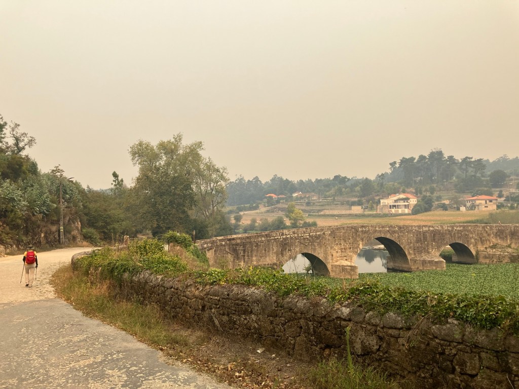 We met a couple dozen pilgrims today while walking or in a cafe. The majority that I could recognize by their accents / languages were Americans, then Germans. We also were reminded that a good portion of the Caminho Portugués is only called that if you are walking North, towards Santiago. That’s the way the yellow arrows / trail markings point us. Often there are blue arrows on the opposite side of the pole, tree, pylon, etc. that point the way to Fatima. We met our first Fatima bound pilgrim today too. This young French lady passed by us today but she said that she hadn’t seen another Fatima pilgrim in several days. She also said she walked south out of Ponte de Lima two days ago, past that closest fire, and she met several pilgrims heading north that day. She could tell by the smell that it was a fire but she hadn’t checked the news to find out that there were many uncontrolled wildfires in her path. Blessed are the non-curious, as they shall inherit the earth…. worms.