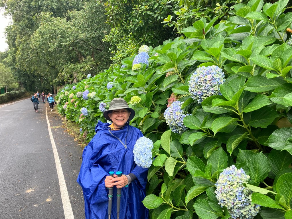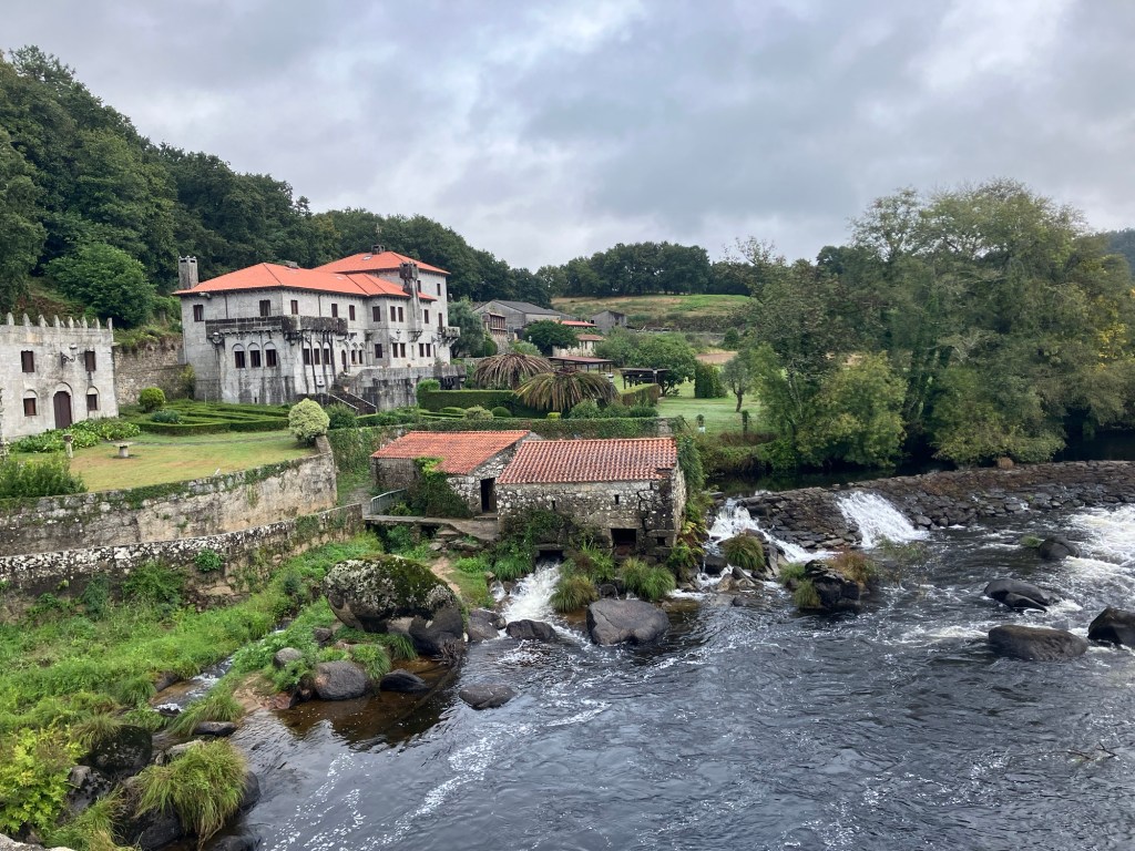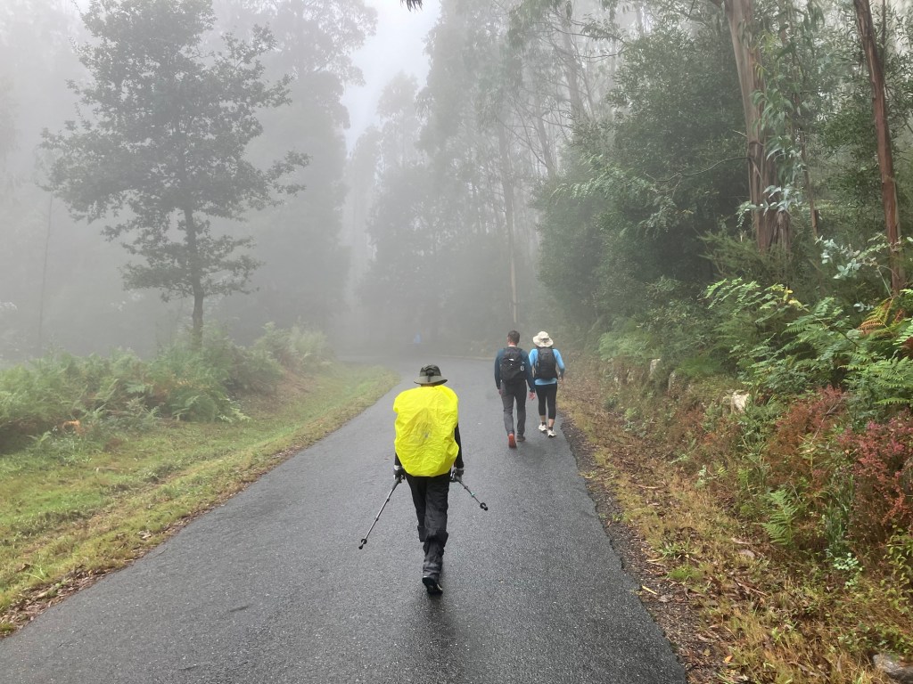 Allow me to set the scene. A couple of days ago, the weather service predicted rain for today, tomorrow and Thursday. I think that is why I wasn’t sleeping so well after arriving in Santiago. The weather and the fact that we have never walked this route before were likely both contributory reasons. Yesterday, Santiago had miserable weather, very cold and an all day drizzle. We expected the same for today and packed our gear accordingly, just before going to bed last night. Being the genius that I am (according to Melanie and I have the receipts), after climbing into bed, I checked the forecast one more time. Suddenly, it said the rains will only come tomorrow and Thursday. Today’s forecast was now for ideal walking weather, 60ºF/16ºFC, overcast, no rain and light breezes. It was too good to believe. I remember waking up and thinking, did I dream that forecast? At 6:00am when we woke up, the forecast was for the same great weather. I looked outside and as best I could tell, the roads were was dry and no one out there had an umbrella or heavy coat. I’ll spare you any more details but when we walked out of the hotel, the ground was now wet, there was more of a fine mist falling, not as bad as a drizzle but it was fairly warm with no winds. I have no idea how that all happened in an hour.