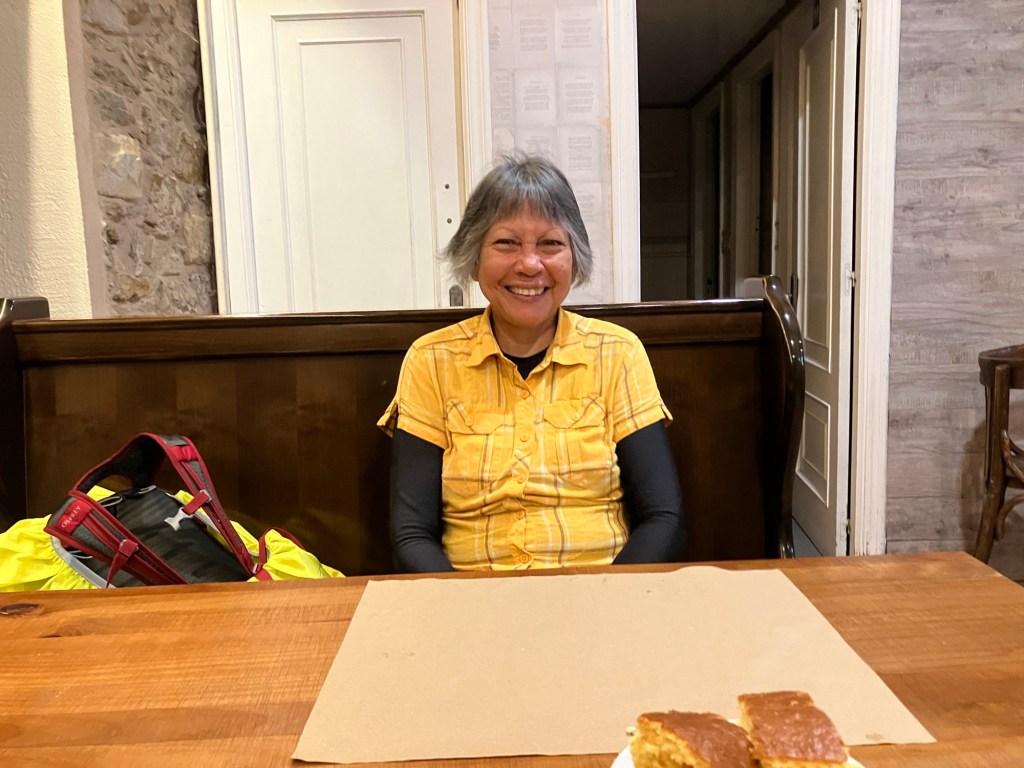 Our plan today was to leave the hotel at 7:00am, walk 3 or 5 km, then get breakfast. Melanie rightly vetoed that idea as we were about to leave 30 minutes late (my tardiness) and it was already pouring. The hotel breakfast was available at that time so we agreed to eat there then walk straight through the 22km-ish day. We still stopped at the 5km bar for a toilet break though and I can’t just not order anything but still use their toilet. So I got a chocolate-filled croissant and a peach juice. Melanie got a banana. Then I got sick.