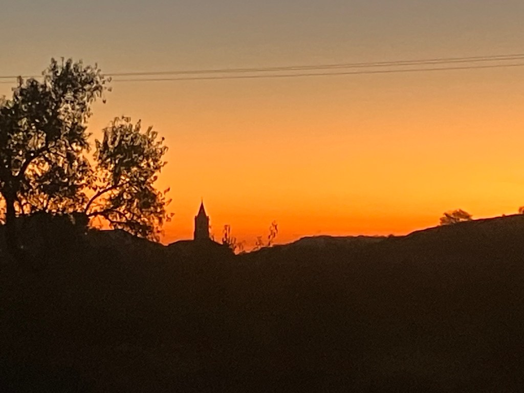 It’s strange but I would have sworn that today’s walk was very flat until Nájera and then there was a steep climb up 150m or so then flat again the rest of the way to Azofra. Of course, I would have been wrong.  I just looked at details of the walk that my Garmin watch measured and there was a gentle incline of 120m up over the first 8km, then a gentle drop of 200m over the next 8km, then that steep climb of 50m, not 150m, after Nájera before finishing the day with bumpy ups and downs on small rolling hills. I think my mind was just overly occupied today.  In the first hour I just admired the color in the sky at sunrise.  After that, there was a long debate in my head (and a shorter one with Melanie) as to whether or not we should detour past Ventosa and save mileage.  After that, I wasted too much time regretting my decision about skipping Ventosa as well as my mistake.  Finally, from Nájera to Azofra, I had a great chat with Canadian Roger who is doing his first Camino.