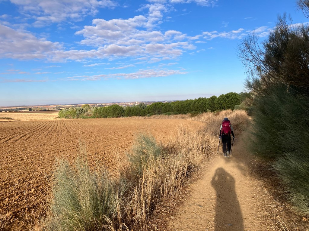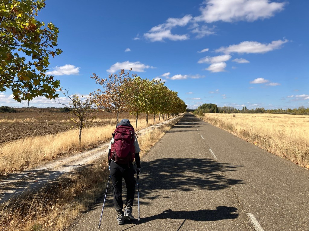 One thing about the Meseta trails that is factual is that a lot of the trails provide no shade from the sun. That it understandable as we are often walking next to farms. Every time we walk this path though, we notice more and more trees being planted along side of the trail. That would be very helpful but I wonder why most of the trees are on the north side of the trail, instead of the south side. That way, they could give shade to the pilgrims instead of the pilgrims casting a shadow on the trees. Today, for a long stretch along a road, the trees were on the correct side of the trail but the autumn sun is at such a low angle already, the trail gets periodic shade from the tree trunks as you pass them but the street gets constant shade from the branches and leaves. This is what I pondered about all day.