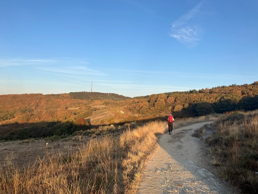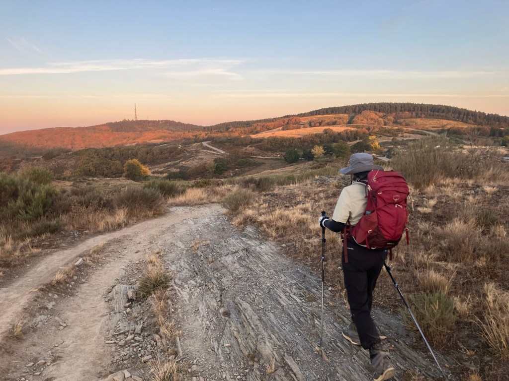 Today’s walk started with a slow walk up a nice trail that soon had a beautiful dawn glow in the sky behind us. In front of us were a string of torchlights walking up the trail (I assume a different pilgrim was holding each one). There were so many stars in the sky and the crescent moon shined just enough to remind me that I should have chosen a croissant for breakfast. The Napolitana was stale. The timing to arrive at the Cruz was perfect. It was quiet and peaceful and we had several minutes alone at the top where we placed our stones near the post holding the iron cross. We said our prayers and asked God to help with the intentions of several friends. I then took too many photos before heading off on the trail again as it started to get a little crowded.