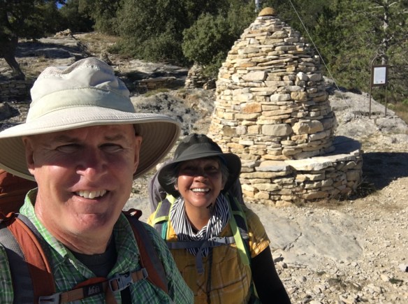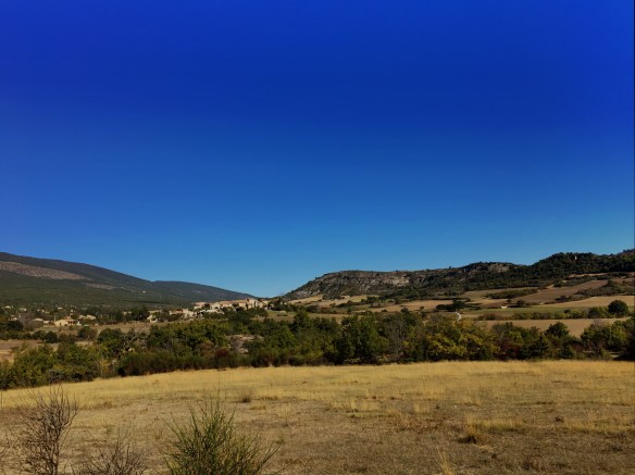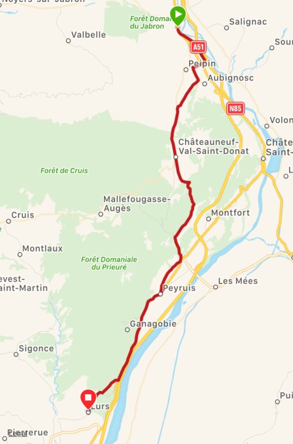 From Peipin, we shortcut a little by going to Châteauneuf-Val-Saint-Donat via the D951 rather than the hilly forest tracks on the GR route. The road was pretty quiet and fine to walk along side of but here is where some of the fun today started. A 70+ year-old man stopped next to us in his car and asked where we were going. We explained that today we were headed to Lurs but eventually, Montpellier was our goal. He started rambling on and gesticulating (both in French) and eventually motioned that he was pulling off the road ahead and he would wait for us. When we caught up with him, I think he was saying that Lurs was too far away and he would drive us. Also, we should not be walking on the road and we must follow the GR blazes. We assured him that we could do it (I didn’t mention the shortcuts) and then he gave us explicit directions on how to get through Saint-Donat. He wished us well and left.