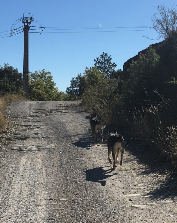 Once off the original Via Domitia, we followed the D101 into Peyrus to search for something to eat and drink. The only thing in town that was open was a kebab shop but that was perfect. We then shortcut down the busy and boring D4096 but, once again, the fun started. We were close to Lurs but, unfortunately, Lurs was on top of a hill. It was only 2.8km away but 220m up a steep hill. We had a choice. We could take the road but that would add 1.2km on it’s winding path. The Camino route was an odd 5.7km that had just as steep a climb in the first half of the route then a flat finish to the day. The most direct route though, appeared to be at a very steep angle but only 2.8km. That’s what we decided to do. Here we broke our rule about doing stupid things.