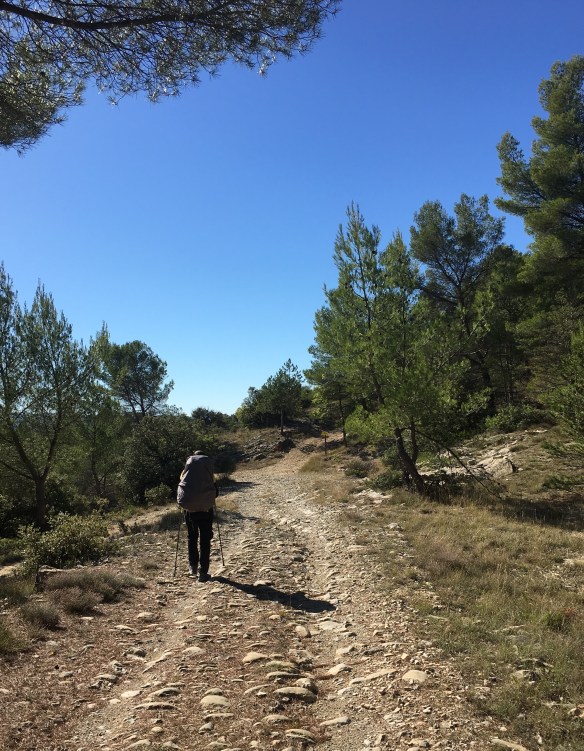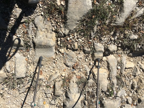 Now at the cairn, I laughed. As directed, the GR route is marked to the right, of course, up hill. All along, we planned to go straight. This’s is where we knew the better Via Domitia road still exists. It wasn’t as clear as we hoped but it was certainly more obvious than before. Walking on it now was slow going but worth it. You had to be careful with every footstep but, at the same time, I was studying the rocks. Eventually I found what I was looking for… the grooves in the rocks left behind by the chariots that plied this route two millennia ago. Melanie wasn’t quite as excited as I was but she was more practical. “Okay, take a picture and let’s go. We still have a long way to go”. She was right.