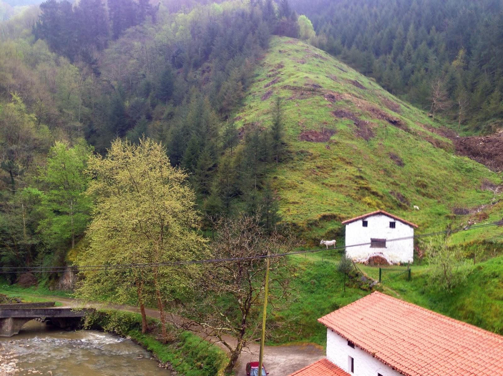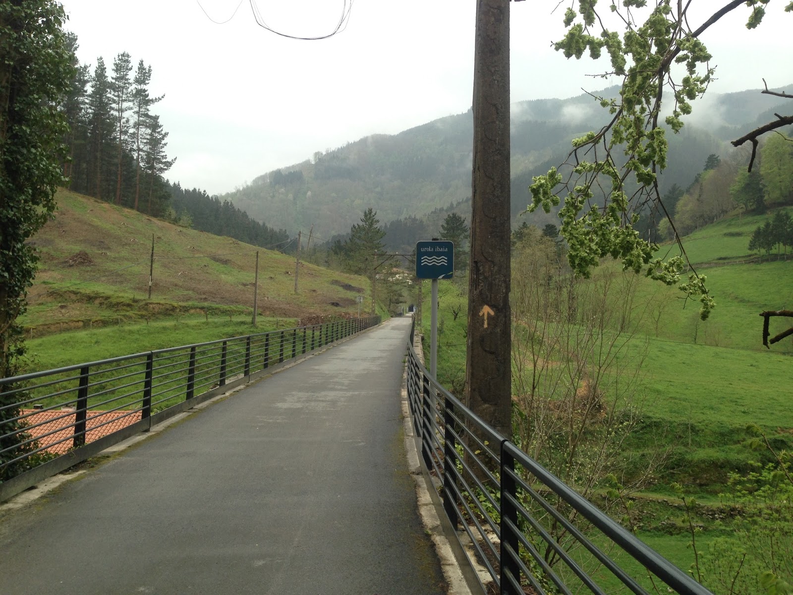 After surviving the sauna of a room in Hotel Arrupe, we had a nice breakfast there and set off at a leisurely 8:40am. The sun was already up!  Boy, were we late! One look outside and we decided not to chance the “over the mountain” route. I was a bit disappointed, not taking the road less travelled but the sky was a gloomy foreboding mess of gray. Walking on possibly hard to follow mountain trails in the rain would not have been a good decision for the first day but I do encourage anyone following us to consider it (as noted in yesterday’s post).