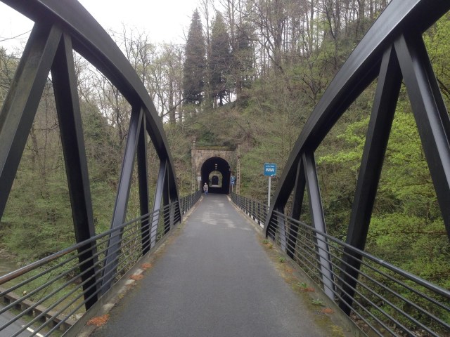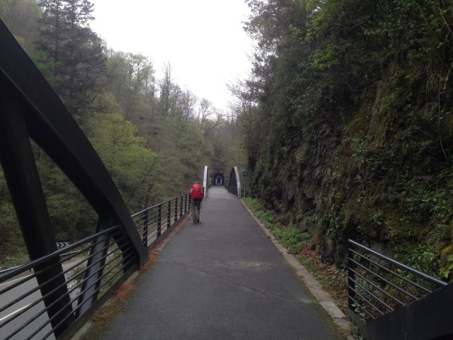 We heard rumours that the orange arrows painted along the trail to guide us were few and far between but that was a major understatement. We came prepared with a GPS track combined with the GPS Kit and an iPhone and followed that rather than searching for missing arrows. Today was easy to avoid getting lost though because more than half the route is along an abandoned rail line that had been paved over. There were not too many places to think about turning one way or the other anyway. If we had, we would have had to climb a steep berm or dig our way out through the side of the tunnels.  The first arrow that we saw was at the 6.66km point (I hope that wasn’t a sign).  After that point, there were many more arrows but every one was either leading us into a tunnel, directing us to continue through the tunnel or directing us out the other end. I kid you not. Everyplace where there actually was an option to turn right or left, there were no arrows. Don’t let that scare anyone thinking of following us though. The GPS tracks are downloadable on the caminoignaciano.org website and GPS Kit cost only a few dollars (and maps.me is better and free!). It is not a battery hog either and it does not use any 3G/4G data.