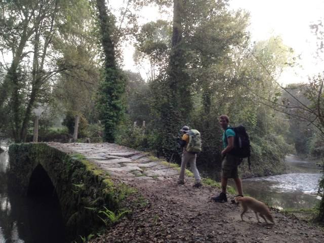 We were rewarded for our early start with a nice sunrise and a quiet walk to the Cruceiro San Telmo. San Telmo died at that spot while returning from his own Caminho in 1251. We said our prayers and headed over yet another medieval bridge but not before picking up a new friend. The cutest little puppy started to follow us so we gave him the name San Telmo. He was very playful and kept jumping up to lick our hands to get us to stop walking and play with him. He didn’t like to be told to go home and he had such a hurt look in his eyes when he did give up on us after about a kilometer. I really wanted to adopt him but that could be a problem in albergues, busses, train and planes over the next ten days.