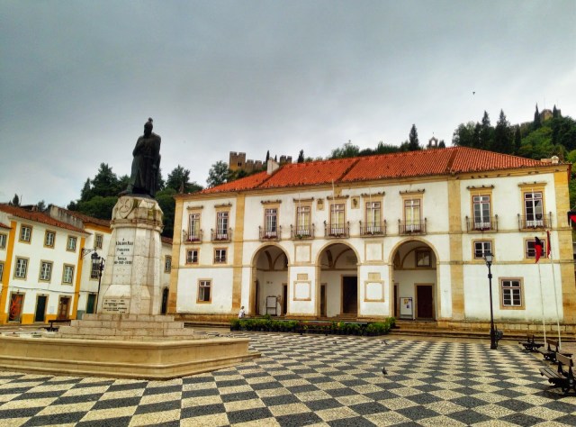 The square between the church and the municipal building in Tomar. The old fortress / convent is on the hill in the background.