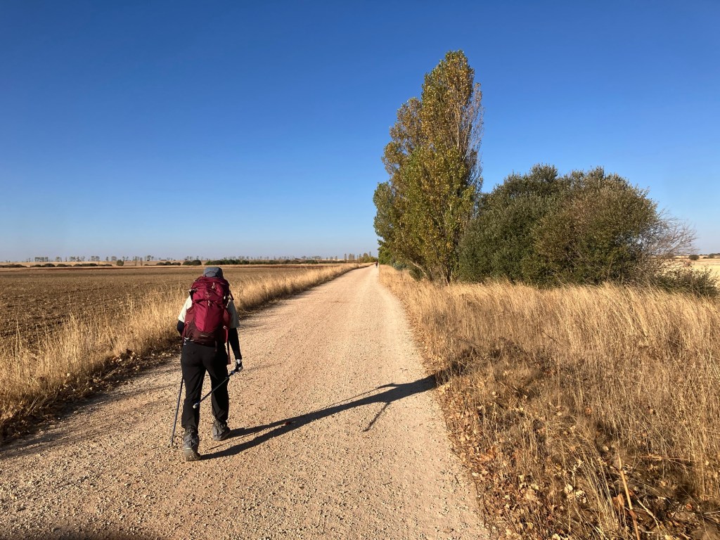 There was a lot of talk and worry in Carrión last night due to the first 17km of today’s walk not having any regular place to stop and sit down, have a drink or some food, and – most importantly, a place to pee. This is the longest stretch on the Camino Francés without services although there is often a small food truck at the 7km mark. The main problem in summer is that there isn’t anywhere to fill up on water. Well, it isn’t summer any more. It was hot, but not Spanish summer hot. Also, the “possibility” of a food truck turned into the reality of a food truck at 4km, another at 7km and another at 9km. We didn’t stop at any of them although we probably should have. The last 2km of that stretch had us both dragging a bit.