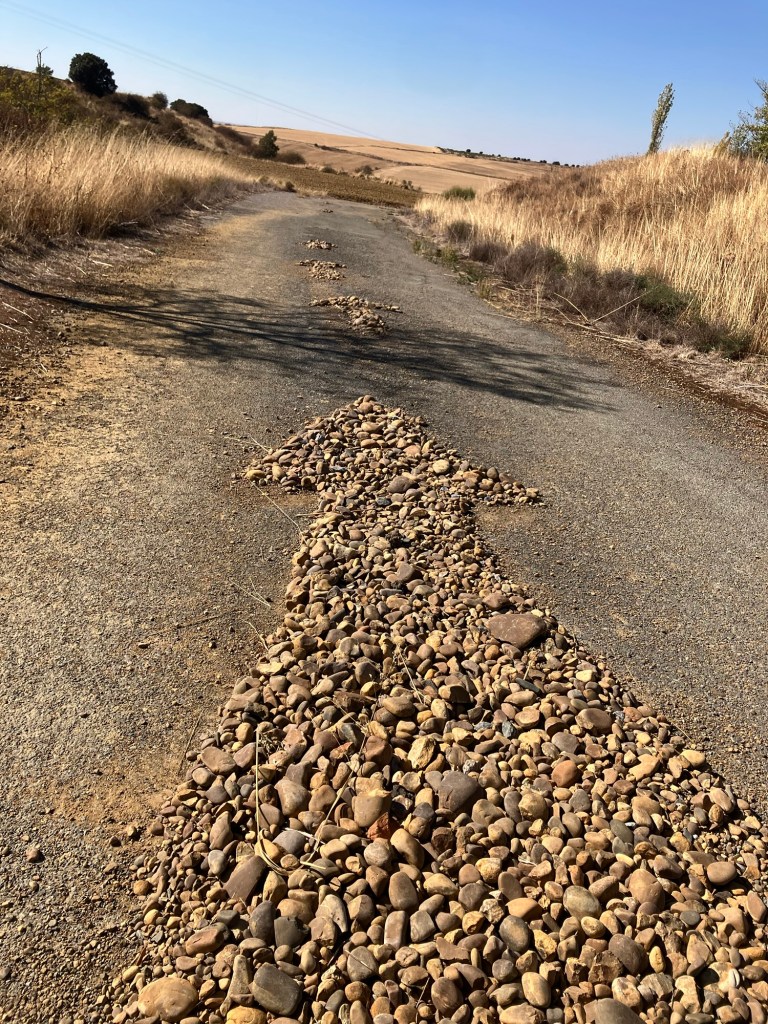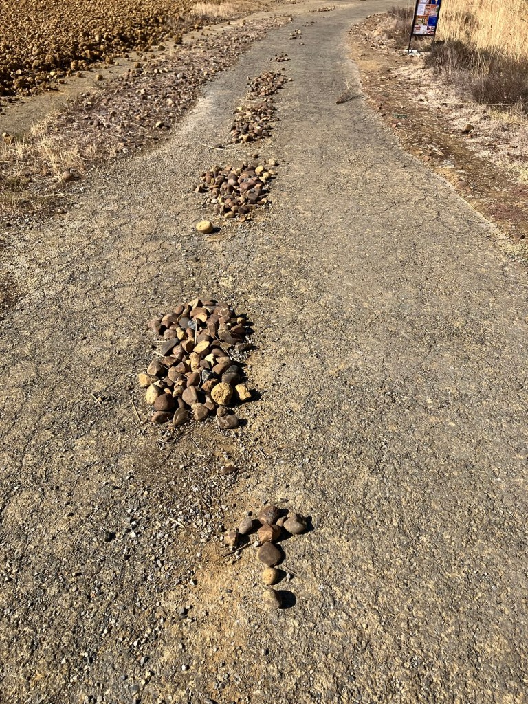 It was a challenging day with a surprising reward at the end. Today’s trail was as flat as frog roadkill, at least until the last kilometer or two. A few small hills would have been nice but what we would have appreciated more was some shade from the sun or a single lick of a breeze. Neither ever made an appearance. We started walking at 7:30am while it was still dark but an earlier start might have been wiser.
